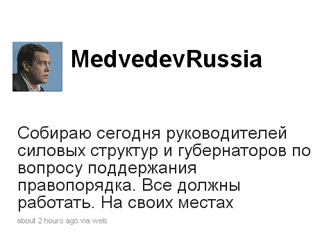 Напомним, что до сих пор президент не делал официальных комментариев по поводу произошедшего накануне в Москве и ряде других городов. О реакции главы государства можно было узнать только из его Twitter, в котором он решил обойтись без резких заявлений. Процитировав пост другого блоггера ("Смотришь в Twitter - мрак и ужас. Едешь в метро, идешь по улицам - все тихо. @MedvedevRussia, вот такой у нас Twitter"), Медведев таким образом намекнул на то, что ничего особенного на самом деле не происходило и медиареальность якобы сильно отличалась от действительности.