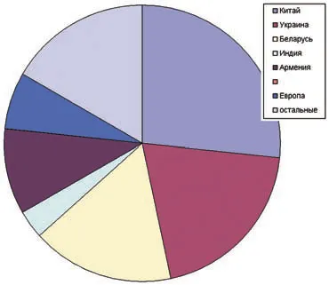 Из каких же стран приходят статьи в наши журналы? За 2009 год в биологических журналах РАН вышли статьи авторов (без соавторов из РФ) из 11 бывших республик СССР (кроме Эстонии, Киргизии и Туркмении) и из 23 стран дальнего зарубежья. Более одной статьи и более, чем в одном журнале, представили 9 и 14 стран соответственно. Однако более-менее существенный вклад дали учёные из 6 стран. Из всех зарубежных статей (без соавторов из РФ) четверть представили учёные Китая, 21,5% — Украины, 13% — Белоруссии, 7,4% — Индии, 5,3% — Армении и 3,2% — Ирана. Учёные стран Европы без стран бывшего СССР представили 8,8% статей. Вклад отдельных стран в пул зарубежных публикаций представлен на рисунке 1. Для сравнения приведены данные для отдельных журналов с 30 и более зарубежными статьями. Отмечу, что в этих трех журналах опубликовано около 40% всех работ зарубежных авторов за 2009 год. Как видно, в журналах-лидерах доля работ китайских авторов ещё выше. Высока она ещё в двух журналах первой восьмёрки – «Молекулярная биология» и «Генетика», в остальных же журналах статьи из Китая встречаются в следовых количествах.