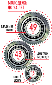 | Доверие без голоса Аналитический центр Юрия Левады в декабре 2010-го провел социологическое исследование среди молодых людей в возрасте до 24 лет. Премьер-министру Владимиру Путину доверяют 49% опрошенных, президенту Дмитрию Медведеву — 43%, на третьем месте с большим отставанием глава МЧС Сергей Шойгу — 15%. Голосовать за Путина-президента на предстоящих выборах готовы 29% опрошенных, за Медведева — 19%. А 20% не смогли выбрать и остановились на кандидате «и за того, и за другого». 18% просто затруднились дать ответ, а 14% готовы голосовать за кого угодно, но только не за тандем. Источник: «Левада Центр» |