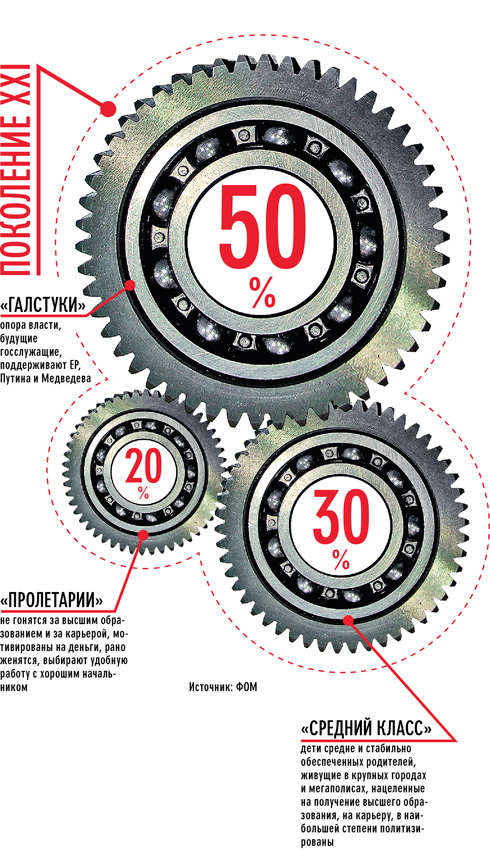 «Третья и самая большая группа, в которую входит до 50% молодежи, это, если хотите, «болото» или ядро поколения, — рассказывает Паутова. — Они — полноценная опора власти, люди, испытывающие почтение и к государству, и к начальству как таковому. Это будущие бюджетники — учителя, врачи, бухгалтеры, госслужащие. Они нацелены на стабильность, поддерживают ЕР, Путина и Медведева и больше всего стремятся сохранить статус-кво. Тем не менее они не только пофигисты (таких и среди взрослых полно), но и люди, которые могут думать о чем-то еще, кроме денег, поскольку их родители скопили за «нулевые» годы некоторый жирок».
