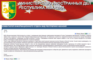 МИД Абхазии выражает обеспокоенность "в связи с очередными агрессивными заявлениями президента Грузии Саакашвили", сделанными им 25 января в прямом эфире вновь созданного канала ПИК (Первый информационный кавказский), передает ИТАР-ТАСС.