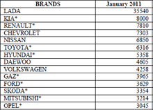 Продажи новых легковых и легких коммерческих авто в январе 2011 года увеличились на 72% по сравнению с январем прошлого года и составили более 127,5 тысячи автомобилей, сообщается в отчете Ассоциации европейского бизнеса (АЕБ). Наибольшей популярностью у россиян пользовалась Lada, а среди иномарок - модели южнокорейской Kia.