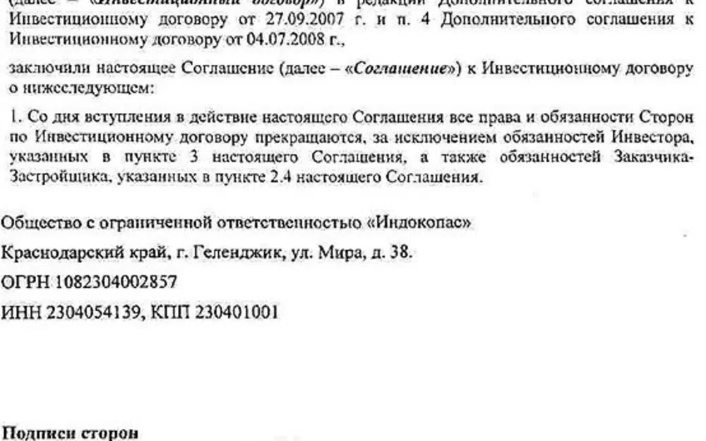 Как удалось выяснить «Новой газете», сегодня структура собственности ООО «Индокопас», которому формально и принадлежит дворец, поменялась: 14 января 2011 года ФАС удовлетворила ходатайство о присоединении «Рируса» к «Индокопасу». Под этим дополнительным соглашением к инвестиционному контракту стояли подписи представителей инвестора, заказчика-застройщика и… управляющего делами президента Владимира Кожина, который сегодня на голубом глазу заявляет, что его управление никакого отношения к строительству дворцов на берегу Черного моря в районе Геленджика не имеет.