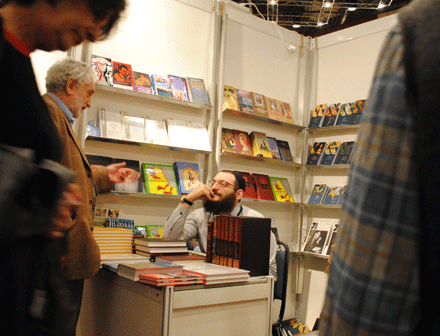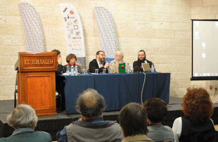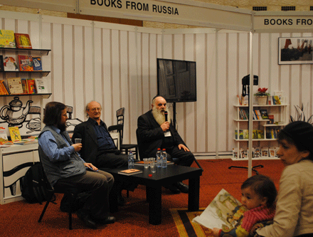 В среду Национальный стенд России работал как площадка для израильских издательств, публикующих книги на русском языке. Сначала "Гешарим-Мосты культуры" представляло книгу Моше Иделя "Каббала: новые перспективы". Книга известная, теперь ее перевели и на русский. Представляли ее глава издательства, автор и переводчик, Константин Бурмистров. Как было сказано в анонсе, "Приглашаются: изучающие каббалу и еврейскую мистическую традицию и интересующиеся ею, русскоязычные". Все это интересно, однако ж что тут делать рецензенту, не попадающему ни в одну из категорий? Так что просто картинка.