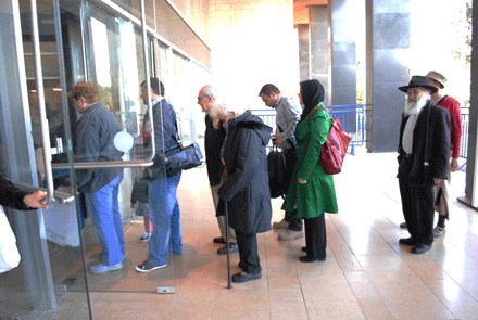 Это не просто очередь на вход, а мечта российского руководства: там рамка и досмотр. Впрочем, лиц с бэйджами не досматривают. И это правильно, а то замучаешься выходить курить.
