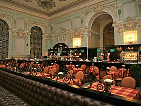 Нужно пройти мимо сонных сограждан, сидящих на чемоданах в зале ожидания №6, и пред вами предстанет грандиозная зала с золоченой лепниной и бесконечно высокими потолками, покрытыми фресками с архитектурными и природными видами. Это и есть «Доброе дело». Оно похоже на столовую хорошего советского санатория, будто перенесенную в наше время с помощью машины времени.
