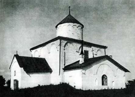 Это был период поиска новых форм в зодчестве. В итоге — несколькими десятилетиями позже пришли к таким шедеврам, как храм Спаса на Ильине улице или Федора Стратилата на Ручью (см. ТрВ-Н, № 73, 15.02.2011, «Храм воинов на Ручью»). Но на Ковалеве мы видим некоторый промежуточный вариант. Кубической формы храм окружен тремя притворами разного размера, формы и назначения. Западный служил входным тамбуром, северный, двухэтажный вообще не соединялся с храмом и использовался для хозяйственных нужд, а в его верхнем, арочном проеме была звонница, южный же притвор сначала был усыпальницей, а потом стал приделом — дополнительным храмом.