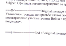 Таким образом, выполнена просьба организаторов премии, обратившихся в среду к участникам арт-группы с просьбой до 4 марта письменно подтвердить свое участие в конкурсе. Также оргкомитет просил у "Войны" уточнить название их акции, которое в одной поданной заявке указано как "Член в плену у КГБ", а в другой - "Х.. в плену у ФСБ". Получен ли ответ на этот вопрос, не сообщается.