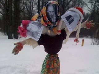 Экологи соорудили большое трехглавое чучело Масленицы с фотографиями Путина, Левитина и Улара. У большого чучела активисты поставили два маленьких: маленького Путина и маленького Левитина с картой прочерченной через Химкинский лес дороги и надписью: "Клал я на вас!" Активисты Эковахты по Северному Кавказу сопровождали мероприятие барабанным боем и звоном бубна. "Руки" большого чучела были вымазаны "в крови тех, кто пострадал в борьбе за лес и в целом права жителей города Химки...", говорится на сайте "Экооборона".