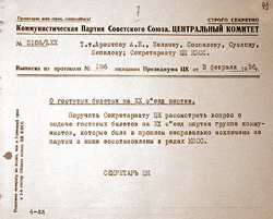 Большинство членов и кандидатов ЦК, избранных XVII съездом и подвергшихся арестам в 1937-1938 годах, были исключены из партии незаконно, с грубым нарушением Устава партии, поскольку вопрос об их исключении не ставился на обсуждение Пленума ЦК.