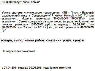Стартовая цена аукциона - 495 тысяч рублей. "Сумма контракта за один месяц (апрель, май, июнь) не должна превышать 165 тысяч рублей, за период с 01 апреля 2011 года по 30 июня 2011 года (за второй квартал 2011 года) не должна превышать 495 тысяч рублей", - говорится в конкурсной заявке.