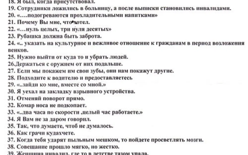 Во-вторых, по рукам подчиненных до сих пор ходит ксерокопия диктанта их командира, в котором на 13 строк текста около 20 ошибок, и, в-третьих, — за подполковником записывают и увековечивают сказанные и написанные им перлы типа: «Комар носа не подкопает», «Подходите к водителю и предоставляйтесь», «Что у пьяного на уме, то у трезвого на голове», «Необходимо активизировать работу преступников», «Палка на двух концах», «Отменяй поворот прямо» и так далее, и тому подобное.