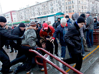 Однако все происходящее очень быстро стало напоминать российские "марши несогласных". Как передает оппозиционная "Хартия'97", спецназовцы в штатском стали задерживать людей уже на походе к площади Якуба Коласа. Журналистам удалось услышать из милицейской рации: "Работаем по предварительному плану. Превентивное задержание при подходе к площади".