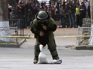 Место было оцеплено и вызваны саперы. Жителей окрестных домов предупредили, чтобы они не подходили к окнам. Как сообщает "Интерфакс", на показанных по телевидению кадрах сапер в специальном обмундировании подорвал пакет прямо посреди улицы. Взрыв получился несильный, как хлопок.