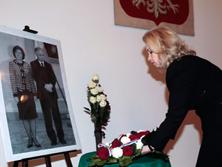 Медведева, которую у дверей посольства встретил посол Польши в России Войчех Зайончковский с супругой, возложила венок к портрету Леха Качиньского с женой, который установлен в центральном зале польского представительства в Москве.