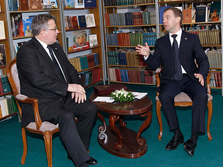 В свою очередь президент Польши Коморовский выразил уверенность, что Москва и Варшава "в состоянии найти новые формы сотрудничества как между молодежью, так и на экономическом направлении". Он подчеркнул, что "любые контакты с президентом Медведевым всегда приводят к конкретному результату". Также он отметил, что польская сторона "принимает меры, чтобы идти вперед по пути улучшения российско-польских отношений и российско-польского примирения".