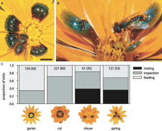 14 морфотипов, отличающихся узором у основания лепестков. Наблюдения в природе и опыты в лаборатории показали, что, действительно, самцы пытаются спариваться с цветками (см. рисунок).