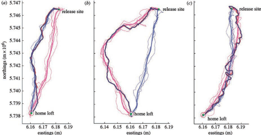 Нарисовав полетные карты голубей, исследователи случайным образом сформировали пары из птиц, отправлявшихся домой из одного и того же пункта, и стали выпускать их по двое. Всего они составили 48 пар, из которых 13 расстались вскоре после старта и добирались домой порознь. Но 35 пар всю дорогу держалось вместе, следуя маршрутом одного из голубей. В 26 случаях из 35 птицы летели путем того голубя, который в одиночку проходил свой маршрут с наименьшими отклонениями. Постоянство привычек оказалось залогом будущего лидерства. Траектории пар обозначены на картинках красно-синими пунктирными линиями. В случаях а) и b) в парах лидировали птицы, не любившие отклоняться от привычного маршрута, в случае с) голубь-консерватор не стал ведущим.