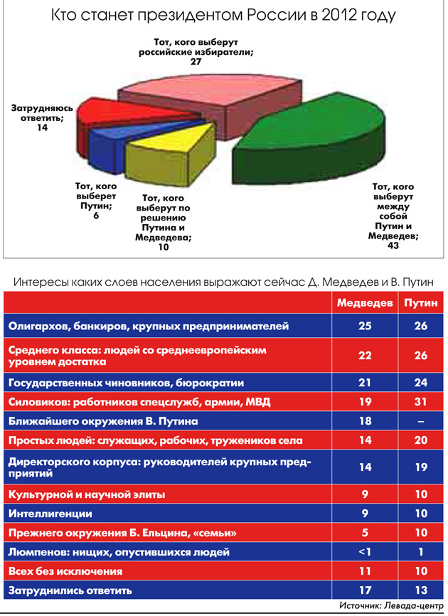 Возможность для изменения массовых настроений существует. Согласно данным Левада-центра, этой весной лишь 10% россиян полагают, что оба действующих правителя отстаивают в своей деятельности интересы всех без исключения граждан страны. Иными словами, подавляющее большинство населения (90%) заинтересовано в приходе во власть, включая верховную, более адекватных нынешнему состоянию общества людей. То есть ориентированных не только на свою локальную группу поддержки из друзей по бизнесу, службе или дачному кооперативу. Дело за малым — чтобы эти люди, наконец, появились. Или, что в наших условиях более вероятно, чтобы один из дуумвиров в своей деятельности обратился к более широким слоям населения, чем ныне.