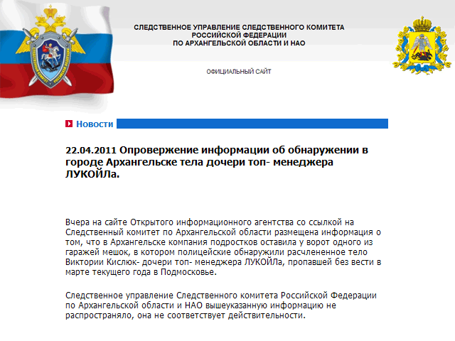 В сыскном ведомстве даже заявили, что непричастны к распространению ложной информации. "Следственное управление Следственного комитета Российской Федерации по Архангельской области и Ненецкому автономному округу эту информацию не распространяло, она не соответствует действительности", - сказано в новом пресс-релизе.