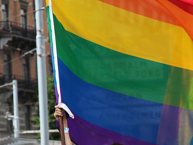 Во время акции к одной из колонн демонстрантов присоединились несколько человек, которые развернули "радужные" флаги гей-сообщества. К ним подошел мужчина, представившийся членом оргкомитета акции, и попросил свернуть флаги.