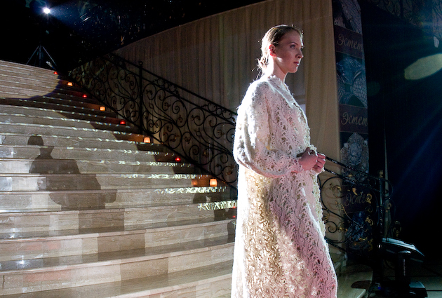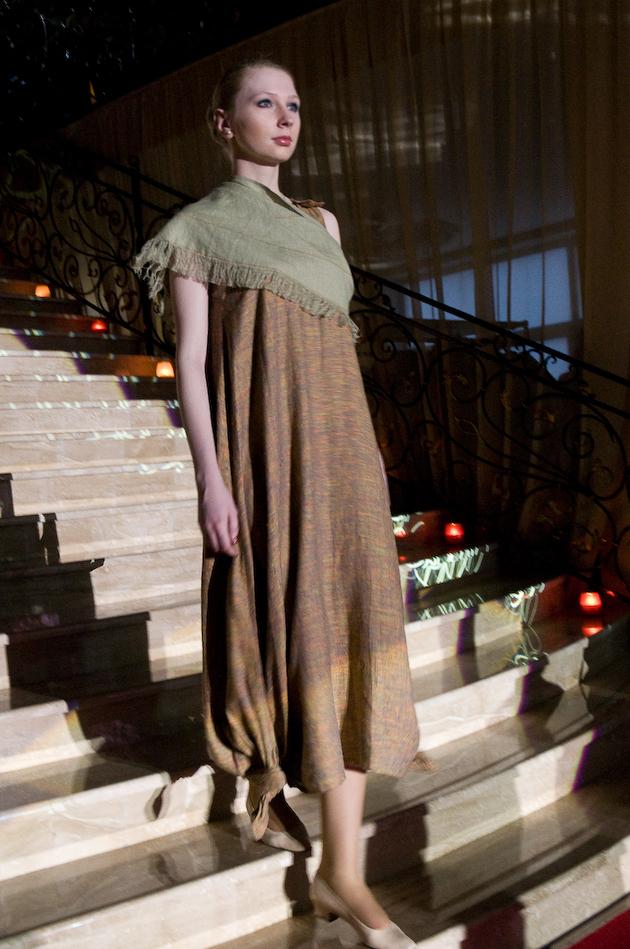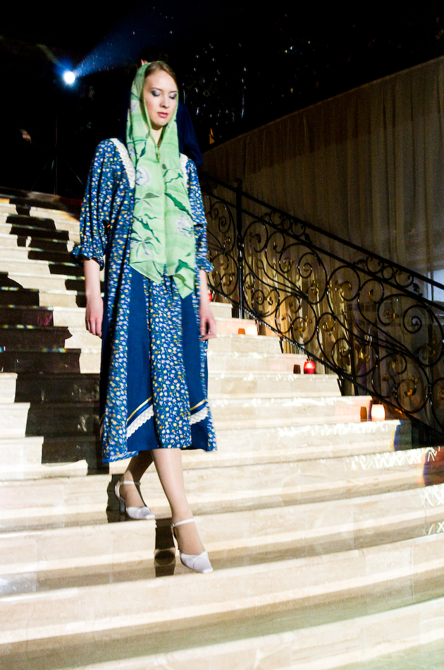 Дальше начались показы, в перерывах между которыми композитор Леонид Тимошенко рассказал, что иконы - «самый большой подарок мира горнего», а певица Татьяна Холодная спела католическую молитву «Аве Мария». Елена Черных одела моделей в кружевные сарафаны с кружевными кардиганами, другие дизайнеры использовали ткани с узором, традиционным для павлопосадского шарфа, лен с вышивкой, неброский ситец с мелким цветочным рисунком.
