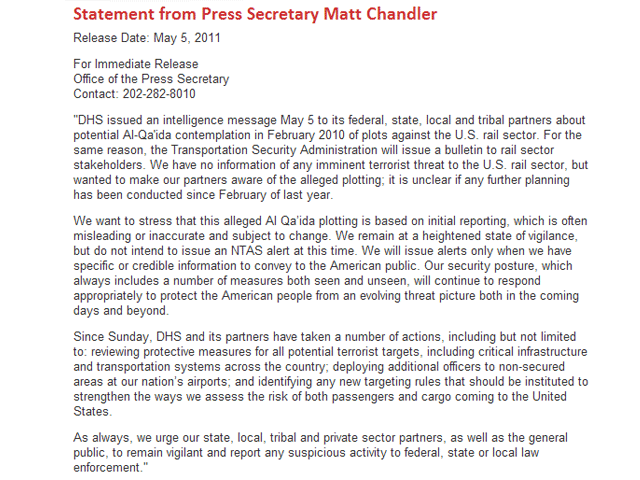 "У нас нет информации о какой-либо реальной террористической угрозе американским железным дорогам. Тем не менее, мы решили известить наших партнеров о предполагавшемся заговоре", - сообщил официальный представитель Министерства национальной безопасности США Мэттью Чандлер.