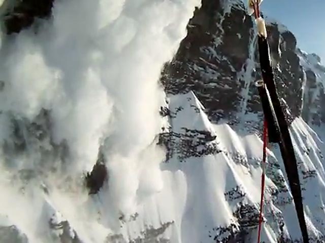 Экстремал бейс-джампер Матье Жиро опубликовал в интернете невероятное видео, снятое во время экстремального прыжка с парашютом в заснеженных французских Альпах. Лыжник, чей шлем оборудован видеокамерой, разогнавшись по склону, прыгает с обрыва и начинает планировать вниз на парашюте, и лишь тогда замечает, что за ним по пятам идет гигантская лавина.