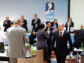 Российскуюзаявку на проведение ЧМ-2016 по хоккеюпредставили в Братиславе президентФедерации хоккея России ВладиславТретьяк, заместитель мэра Москвы вПравительстве столицы Александр Горбенкои заместитель министра спорта, туризмаи молодежной политики России ЮрийНагорных. Ну а Путин уже после оглашениярезультатов поблагодарил участниковконгресса Международной федерациихоккея за избрание России и сделал этона английском языке.