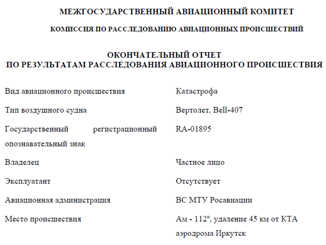 По факту катастрофы следственные органы возбудили дело о нарушении правил безопасности движения и эксплуатации воздушного транспорта (ч. 3 ст. 263 УК РФ). Как отмечает издание, отрабатывая версии о возможных причинах падения воздушного судна, следствие убедилось в том, что вертолет был технически исправен.