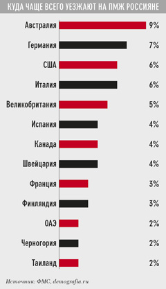 Ученые и инженеры экстра-класса, по словам Игоря Вдовина, едут в США, где наилучшим образом поставлена «охота за головами». География миграции узких специалистов много шире: тут и бывшие страны СССР — Украина, Казахстан и другие. «Многие российские профессионалы, не находя себя на родине, оказываются востребованы там, где их воспринимают как представителей бывшей метрополии», — поясняет Вдовин. Дауншифтеры же едут релаксировать либо в страны Восточной и Южной Европы — от Чехии до Греции, либо в Индию, Китай, на Тайвань. Бурно развивающаяся Юго-Восточная Азия, замечает эксперт, в будущем станет наиболее привлекательным местом для бизнес-эмиграции.