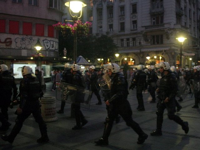 В воскресенье вечером в столице Сербии тысячи людей вышли на митинг в защиту генерала Ратко Младича, найденного на прошлой неделе и арестованного по обвинениям в военных преступлениях. Радикалы не удовольствовались мирной акцией, а устроили беспорядки и стычки с полицией. В результате столкновений были ранены не менее трех человек. По другим данным - около десятка.