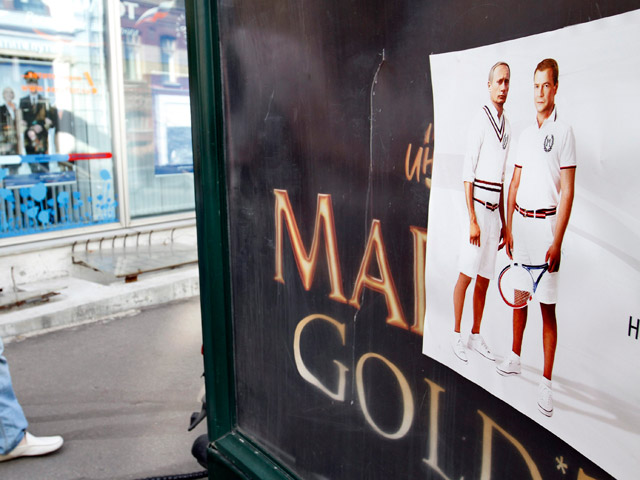 На ряде рекламных тумб в центре Москвы появились плакаты с изображением Медведева и Путина в теннисных шортах и майках и с ракетками.