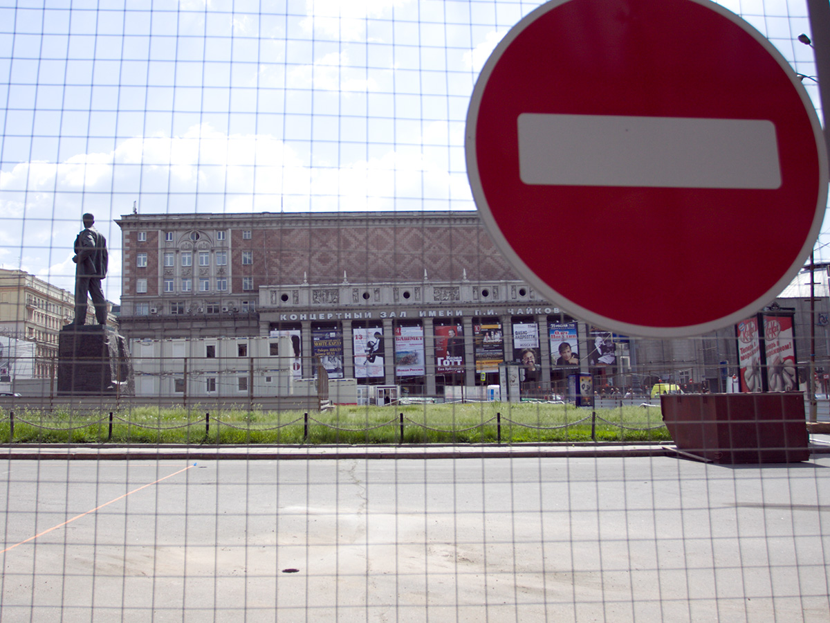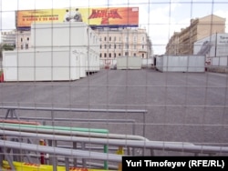 После установки вагончиков для рабочих и охраны, за забором на Триумфальной площади никаких видимых изменений к концу мая 2011 не произошло.