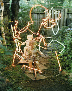 Лайтбокс «Комната художника» А потом к Марине присоединился ее муж Борис Казаков, известный в Питере андеграундный кинематографист. В домиках появился видеоряд. Стал показывать телевизор, в купе поезда проносился за окнами пейзаж. Новый этап начался, когда Марина познакомилась с инженером Сергеем Карловым — ему понравились художественные идеи Алексеевой, и он придумал специальное покрытие для стекла, на которое мини-проектором передается изображение. Так в черных строгих боксах появился мультипликационный персонаж со своим голосом и мелодией, персонаж-призрак, который двигается.