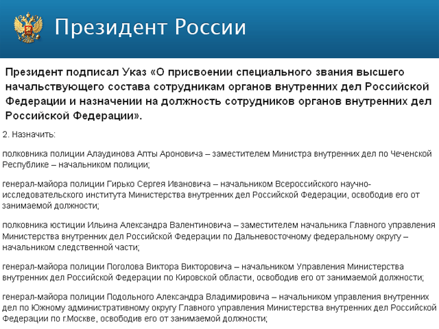 Напомним, в субботу, 11 июня, стало известно, что президент Дмитрий Медведев освободил от должностей трех заместителей министра внутренних дел и подписал указы о новых назначениях в руководстве МВД. Кроме того, глава государства произвел перестановку в руководстве главного управления МВД РФ по Петербургу и Ленинградской области.