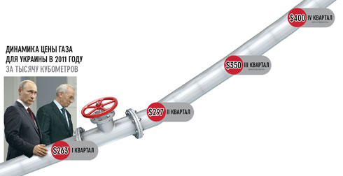 Цена на российский газ для Украины привязывается к мировой цене на нефть и нефтепродукты (мазут и газойль) — Путин продавил эту формулу во время переговоров по газу с тогдашним украинским премьером Юлией Тимошенко в самом начале 2009-го, когда в мире бушевал кризис и цены на нефть упали. Тогда они договорились о базовой цене на газ: $450 за тысячу кубов до 2020 года. При этом цену за транзит поставили в зависимости от куда менее волатильных вещей — таких, например, как уровень инфляции в Европе. При базовой цене с 2010 года $2,04 за тысячу кубометров на 100 км ставка за транзит в I квартале 2011 года выросла по сравнению с IV кварталом 2010-го лишь на 2,2 % — до $2,84 за тысячу кубометров на 100 км. Киев возмущен тем, что цена при такой формуле постоянно растет, а ставки на транзит остаются примерно на том же уровне.