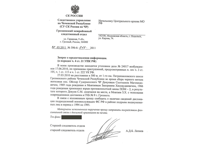 "Или вот запрос по поводу гибели жителей Дуба-Юрта Гайтаровых. Как следует из документа, они погибли на сельском кладбище в результате налета двух самолетов ВВС России. Автор запроса требует сообщить, какие авиационные части наносили 27 июля 2000 года ракетно-бомбовые удары по территории Чечни. Зачем? Что одиннадцать лет в ходе боевых дейсвтий гибли и мирные люди, это, конечно, трагедия. Но почему этим розыском заинтересовались только сейчас?" - рассказал источник "Свободной прессы".