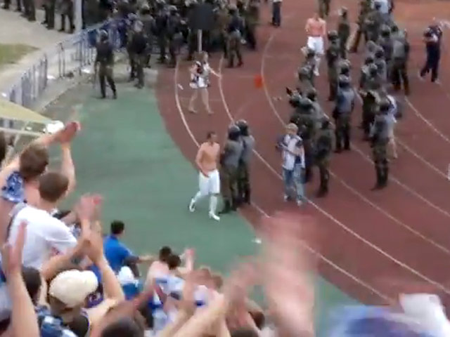 "Сотрудник ОМОНа встал между футболистами и болельщиками с вытянутыми руками. В его руках был электрошокер, но он не применялся", - сказал Шмонин.