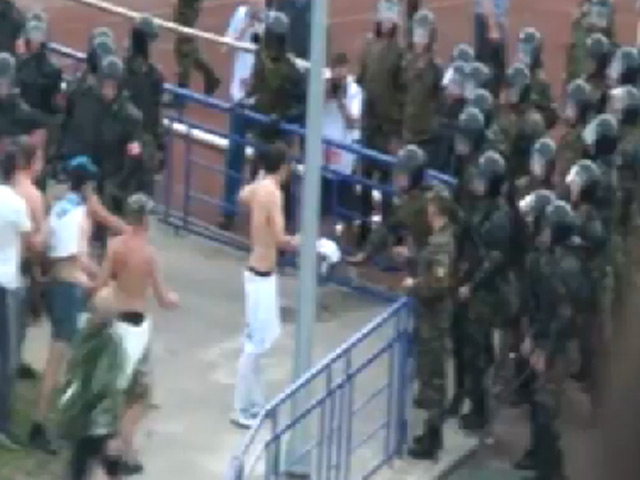 Лазович подошел к трибуне болельщиков своей команды, чтобы бросить им свою майку, но стоявший в оцеплении сотрудник ОМОНа якобы ударил его электрошокером.