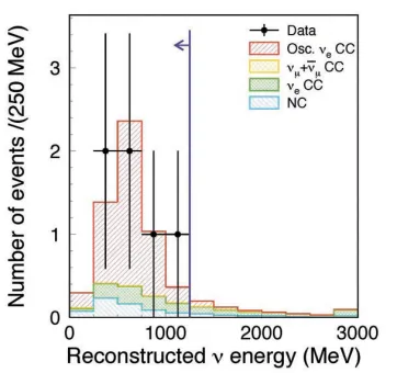 Создание нейтринного канала и ближнего нейтринного детектора было начато в апреле 2004 г. и завершено в 2009 г. Набор статистики был начат в январе 2010 г. За это время в активном объеме детектора 22,5 кт было зарегистрировано 88 нейтринных событий, энергия которых была более 30 МэВ и полностью измерялась в детекторе. Все эти события находились во временном интервале от -2 до 10 мксек по отношению к временному триггеру, синхронизованному со структурой протонного пучка, в то время, как уровень фона от атмосферных нейтрино в этом временном интервале составил всего 0,003 события. После дополнительного анализа 6 событий были идентифицированы как электроноподобные события, появившиеся в результате взаимодействия в детекторе электронных нейтрино с энергией от 100 до 1250 МэВ через заряженный ток (т.е. с рождением электрона и исчезновением нейтрино). Одно из таких событий показано на рисунке 3.