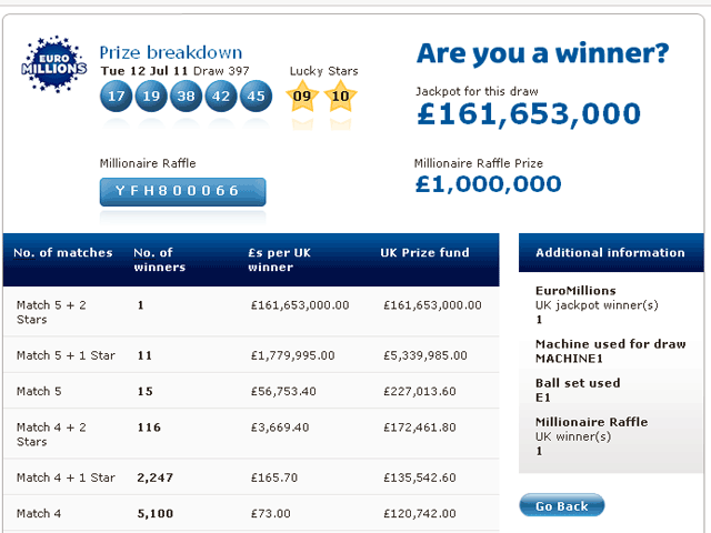 В последнем розыгрыше лотереи 11 участников лотереи выиграли по 2,44 миллиона евро. Предыдущий рекорд выигрыша составлял 130 миллионов евро, и его обладатель также проживал в Великобритании. В EuroMillions, стартовавшей в 2004 году, могут участвовать жители девяти стран: Австрии, Бельгии, Великобритании, Франции, Ирландии, Люксембурга, Португалии, Испании и Швейцарии.