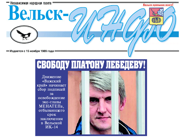 "Наша газета и демократическое движение "Важский край" с сегодняшнего дня начинают кампанию "Свободу Платону Лебедеву!", в рамках которой запланировано несколько мероприятий. Первое из них - сбор подписей под обращением к председателю Вельского районного суда В.Ф.Иванову и судье Н.М.Распопову (который будет рассматривать 26 июля ходатайство П.Лебедева об УДО)", - сообщает "Вельск-инфо".