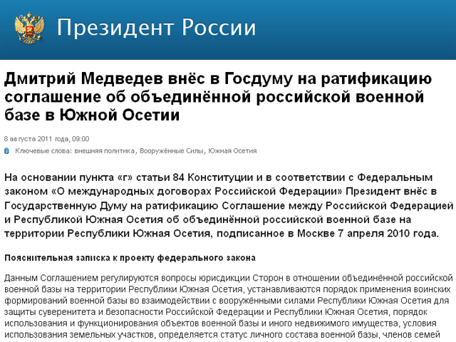Президент России Дмитрий Медведев внес в Государственную Думу на ратификацию соглашения об объединенных российских военных базах на территории Республики Южная Осетия и Республики Абхазия, сообщает официальный сайт Кремля.