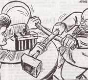 | Карикатура из газеты «Моргенпост»: «Кеннеди голыми руками спасает Берлин от Хрущева». Намек на провал попыток СССР выдавить союзников из города |
