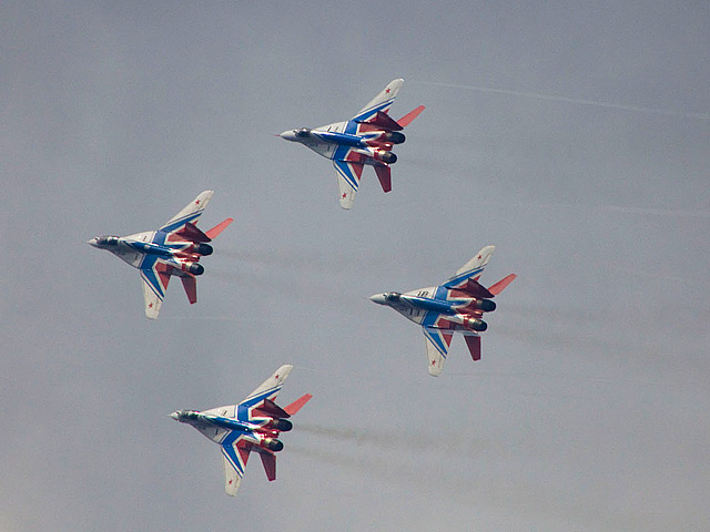 Как сообщил официальный представитель Управления пресс-службы и информации Минобороны РФ по ВВС полковник Владимир Дрик, в день открытия салона "Русские витязи" и "Стрижи" во время полета группой состоящей из пяти самолетов Су-27 и четырех МиГ-29, которую называют "Кубинский бриллиант", впервые продемонстрируют "бочку" одновременно составом всей группы.