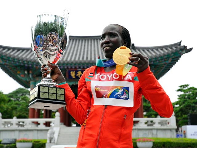 Кенийская бегунья Эдна Киплагат выиграла золотую медаль в женском марафоне - первом виде программы стартовавшего в южнокорейском Тэгу чемпионата мира по легкой атлетике, опередив своих соотечественниц Приску Джепту и Шарон Чероп. Победный результат Киплагат - 2 часа 28 минут и 43 секунды.