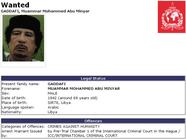 Помимо Каддафи, ордера выданы на арест его сына Сейфа аль-Ислама, который активно поддерживает его борьбу с мятежниками, и на арест главы ливийской разведслужбы Абдуллы аль-Сенусси, сообщает сайт Международной организации уголовной полиции.