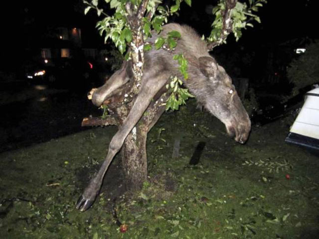 В безвыходное положение лось попал из-за жадности. Закусывая яблоками, он тянулся все выше и выше, пока, встав на задние ноги, не поскользнулся и не повис на ветвях. Прибывшая на место происшествия полиция не смогла снять незадачливого лакомку. На подмогу пришлось вызвать пожарную бригаду. Лишь общими усилиями, наклонив дерево, люди вызволили царя шведских лесов из плена.