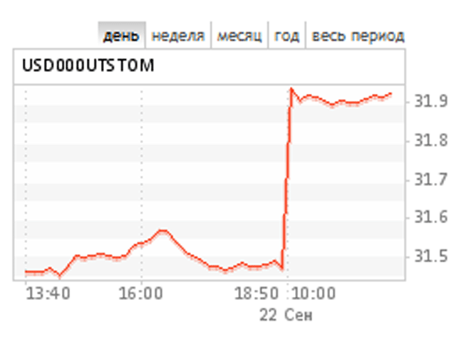 Средневзвешенный курс доллара США к российскому рублю со сроком расчетов "завтра" на торгах единой торговой сессии ММВБ по состоянию на 11:30 по московскому времени, на основе которого происходит процесс курсообразования доллара на следующий день, взлетел на 49,84 копейки и составил 31,9106 рубля, передает "Финмаркет".